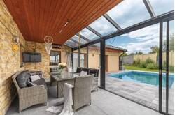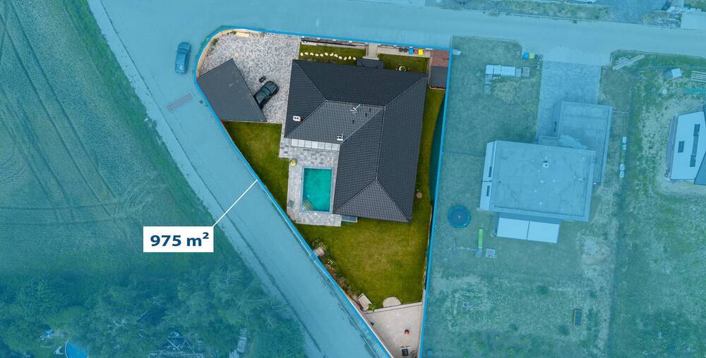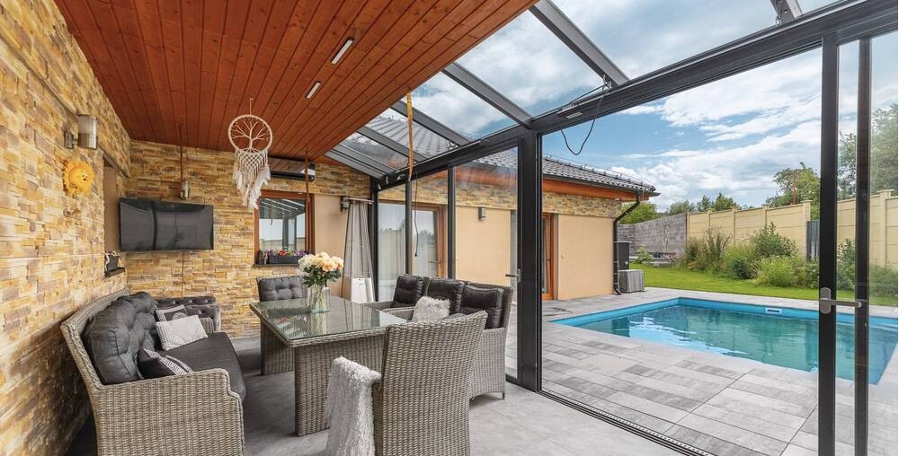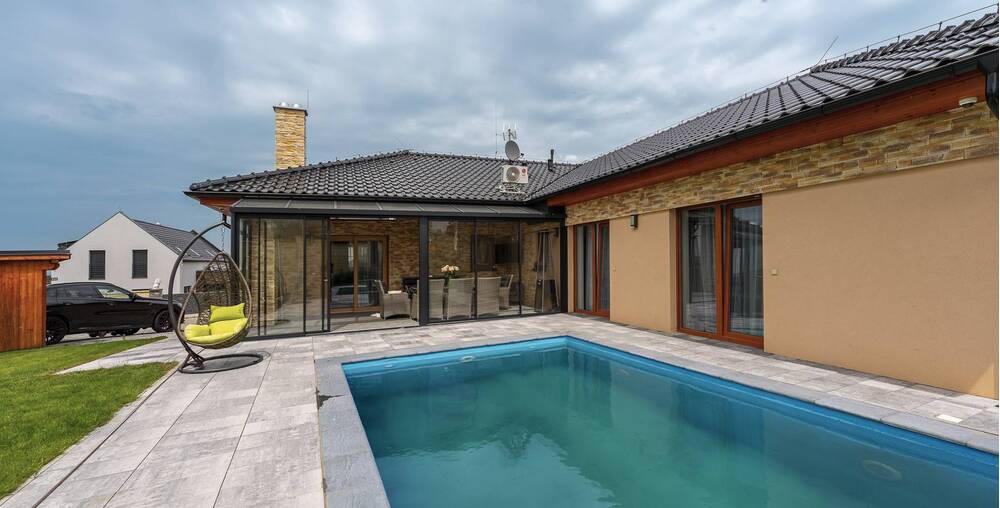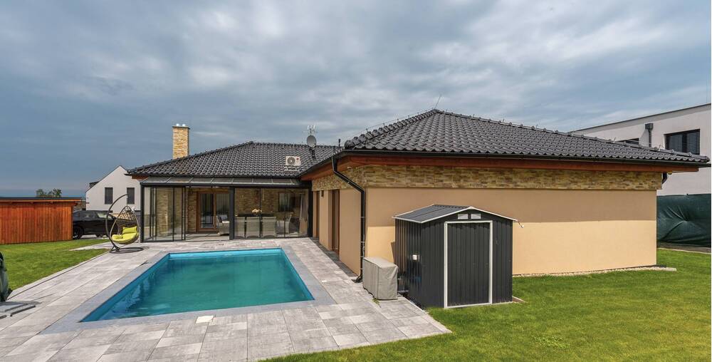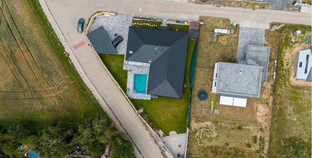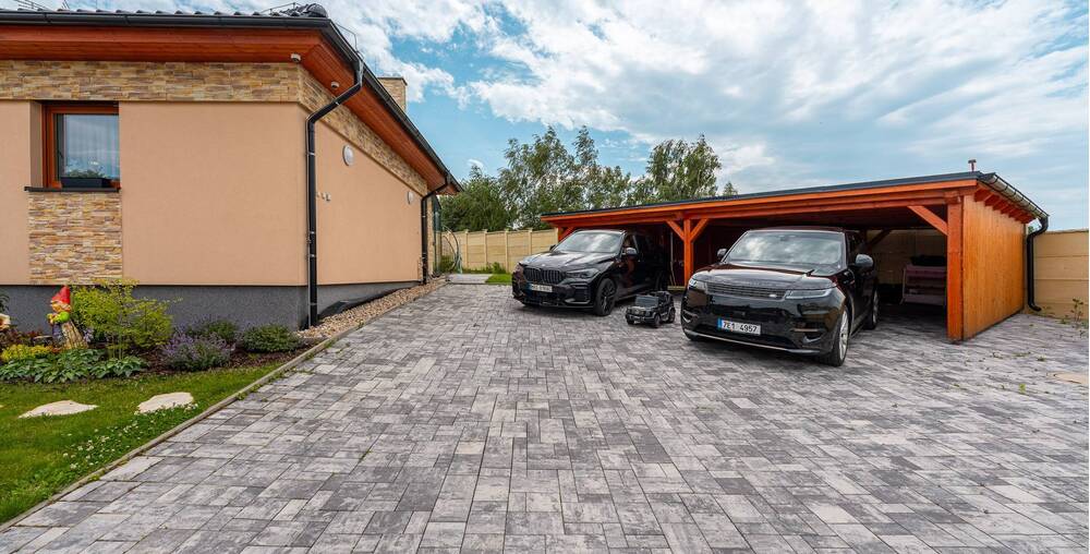 Na zahradě naleznete kryté parkovací stání pro Vaše vozy, což zajišťuje jejich ochranu před nepříznivými povětrnostními podmínkami. Součástí zahrady je také bazén, který se stane oblíbeným místem ke koupání a relaxaci během letních měsíců.